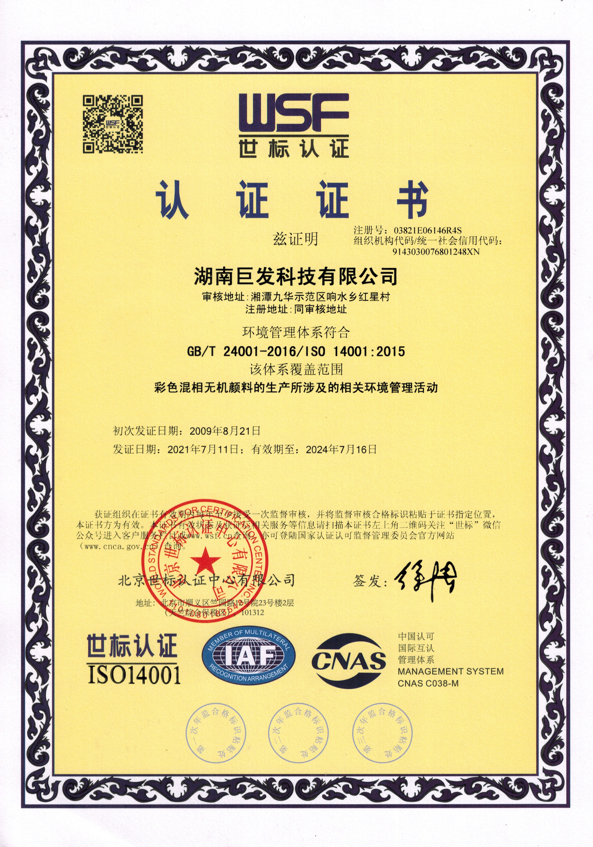 ISO14001 环境管理体系认证证书