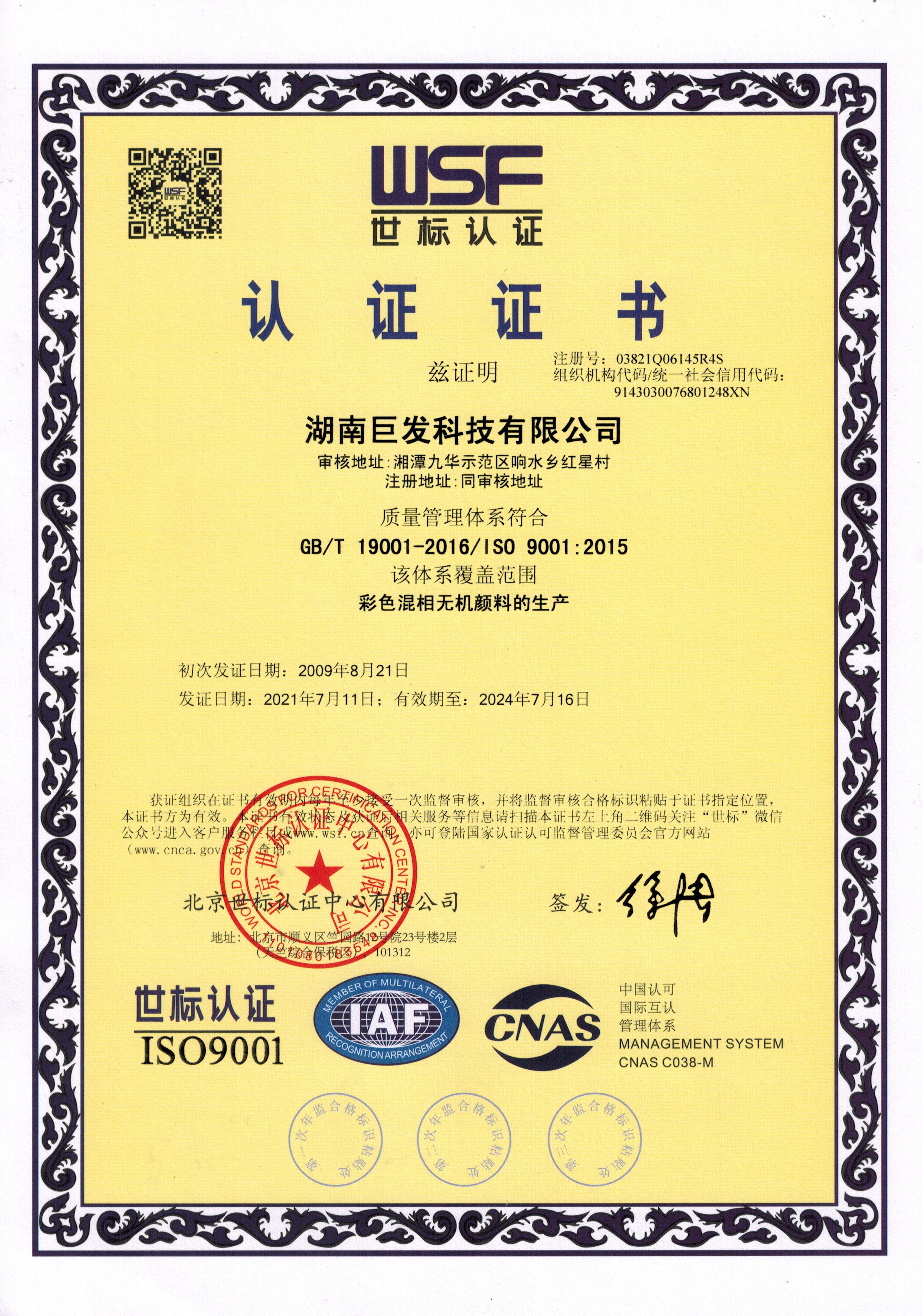 ISO9001 质量管理体系认证证书