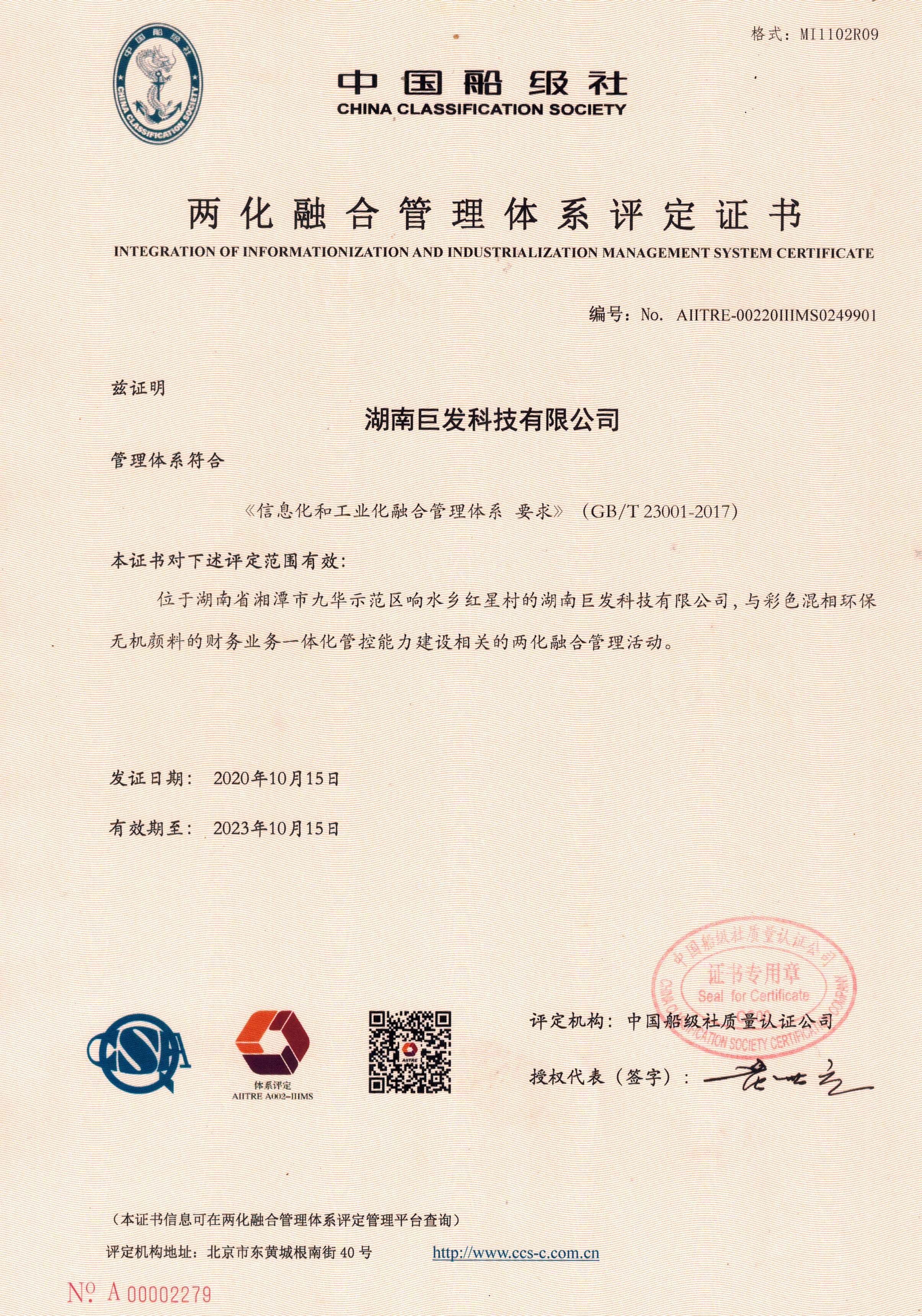 两化融合管理体系评定证书