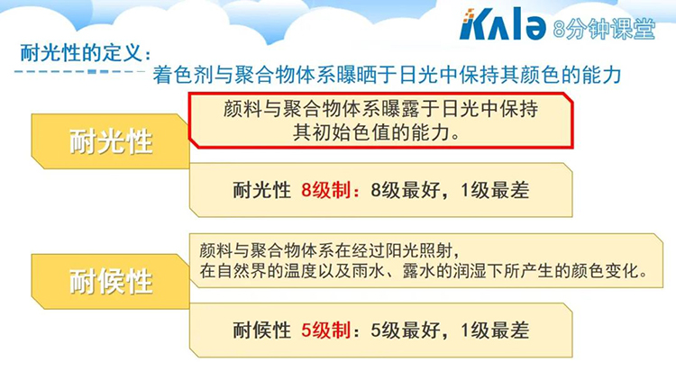 耐光性的定义是指着色剂与聚合物体系曝晒于日光中保持其颜色的能力。着色剂于日光中变化的主要原因是阳光中紫外光线与可见光线对着色产品所引起的破坏。