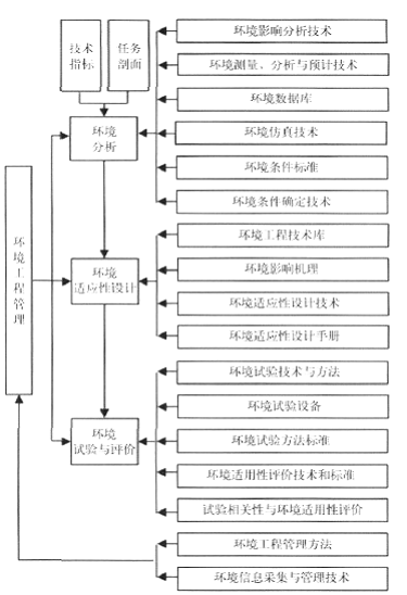 既然环境适应性是武器装备的一个质量特性,它必须靠设计 ( 试验 ) 和制造纳入装备,靠试验和管理来加以保证 [5] 。提出合理的环境适应性要求和确保这一要求得到满足的工作将贯穿装备寿命期全过程,实质就是一个系统的环境工程工作,系统地开展环境工程工作是确保研制生产的武器装备在未来环境中可靠和有效工作的重要手段。